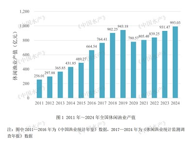 2024年,全国休闲渔业产值993.03亿元(监测数据不包括港澳台和西藏地区,下同),创历史新高,超过新冠病毒感染疫情前最高水平;同比增长6.61%,增速较2023年下降超4个百分点。2011年~2024年全国休闲渔业产值变化见图1。