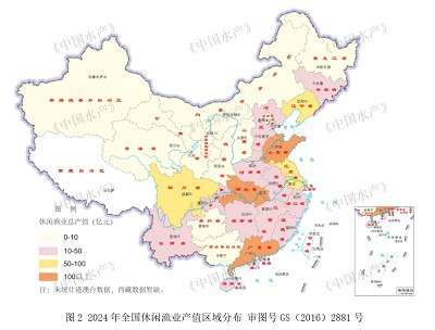 省际发展不平衡,沿海地区11个省份休闲渔业产值总和为586.69亿元,比2023年增加30.68亿元,占全国休闲渔业产值的59.08%;内陆地区19个省份休闲渔业产值总和为406.34亿元,比2023年增加30.88亿元,占全国休闲渔业产值的40.92%。沿海和内陆产值相差180.35亿元,与2023年相比基本保持稳定。