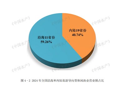 以沿海和内陆划分,2024年,我国沿海11个省份旅游导向型休闲渔业营业额总和245.08亿元,内陆19个省份旅游导向型休闲渔业营业额总和168.48亿元,二者相差76.60亿元。2024年全国沿海和内陆旅游导向型休闲渔业营业额在全国旅游导向型休闲渔业营业额中的占比分别为59.26%和40.74%(见图4–2)。