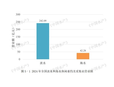 2.休闲垂钓及采集业。2024年,我国休闲垂钓及采集业营业额284.37亿元,同比增长3.46%。其中,淡水休闲垂钓及采集业营业额242.09亿元,同比增长3.87%;海水休闲垂钓及采集业营业额42.28亿元,同比增长1.18%(见图5–1)。淡水休闲垂钓及采集业中,营业额超过10亿元的省份有7个,依次为湖北、江苏、安徽、四川、湖南、江西和山东。前六名均位于长江流域,6省营业额总和173.98亿元,占全国淡水总营业额的71.87%(见图5–2)。海水休闲垂钓及采集业中,山东、广东、辽宁的营业额分别占全国海水总营业额的41.14%、23.15%和16.77%(见图5–3)。