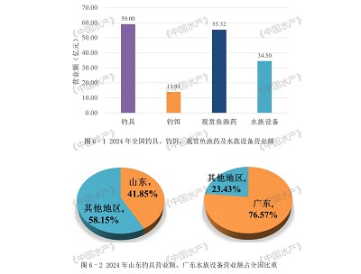 3.钓具钓饵观赏鱼渔药及水族设备。2024年,我国钓具钓饵观赏鱼渔药及水族设备营业额162.73亿元,同比增长11.59%。其中,观赏鱼渔药营业额55.32亿元,钓具营业额59.00亿元,水族设备营业额34.50亿元,钓饵营业额13.91亿元(见图6–1)。钓具产业中,山东的营业额占全国总额的41.85%,但占比较2023年下降超8个百分点;水族设备产业中,广东的营业额占全国总额的76.57%(见图6–2)。