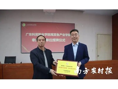 2025年10月24日上午, 广东科贸职业学院观赏鱼产业学院(以下简称“观赏鱼产业学院”)揭牌仪式在白云校区举行。广东科贸职业学院校长王海林、副校长刘思伽与广州市农业农村局市管一级调研员胡卫东、广州观赏鱼专班骨干、企业代表共同为观赏鱼学院揭牌。
