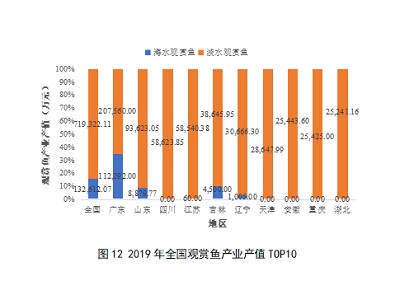 从经营主体数量看,2019年观赏鱼产业经营主体22190个,占总量的16.55%。从业人员约6.93万人,占总量的8.32%。2019年全国观赏鱼养殖设施面积约5504.58万立方米。
